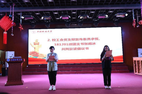 校工会党支部宣传委员李悦同志和181201班团支部书记张雨冰同学共同宣读了“结对领航”倡议书。她们表示:支部结对领航,实现共同进步,不忘初心使命,践行“三全育人”,师生齐心协力,共筑美好未来。